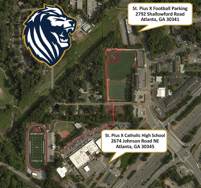 For our guests, we provide parking in the lot at 2792 Shallowford Road, Atlanta, GA 30341 (the sign at the entrance to the lot reads "St. Pius X Student Parking"). It is only a short walk to the main campus and George B. Maloof Stadium.